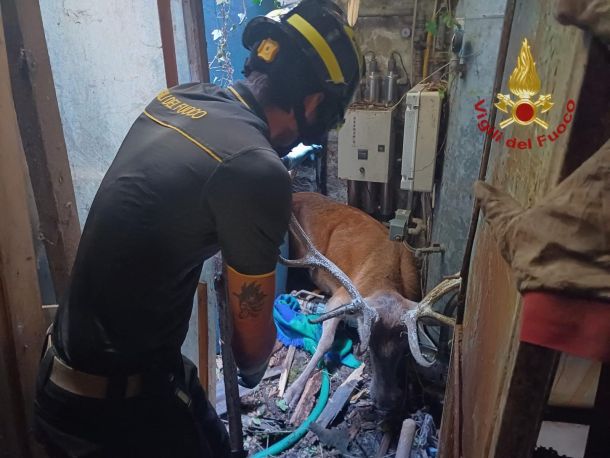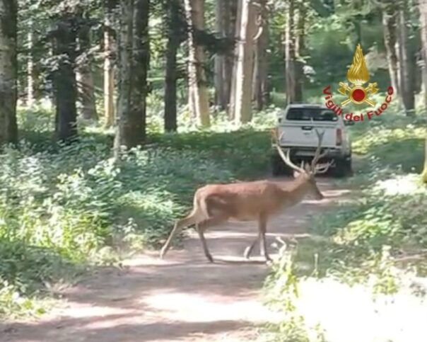 CAMALDOLI (AREZZO) – I vigili del fuoco sono intervenuti nella mattinata di oggi, 15 agosto 2025, a Camaldoli, nel comune di Poppi, per liberare un esemplare di cervo adulto che ha sfondato la copertura di un locale adiacente a un ristorante, rimanendovi incastrato all’interno.