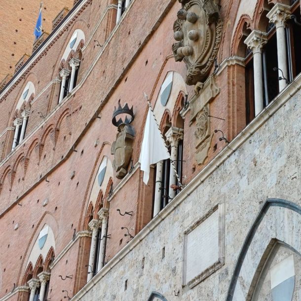 SIENA – Bandiera bianca esposta alle trifore di Palazzo Pubblico in piazza del Campo a Siena.