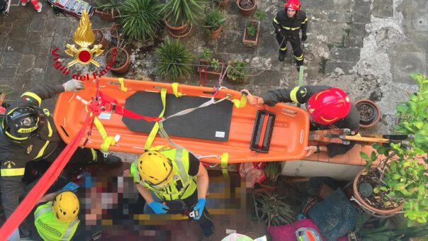 La donna è stata raggiunta dai vigili del fuoco posizionando la scala italiana, facendo salire il personale sanitario che ha valutato e stabilizzato la donna. Nel frattempo la squadra ha creato un ancoraggio all’interno dell’appartamento del secondo piano per effettuare la discesa su corda della donna che è stata immobilizzata sull’asse spinale e su una barella toboga.