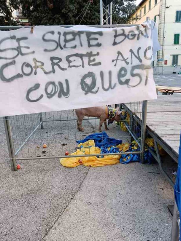 AREZZO – Altro che sfottò tra quartieri della Giostra del Saracino di Arezzo. Il cosiddetto “scherzo del maiale” è finito nel mirino di forze dell’ordine, animalisti e con l’intervento di Comune e Asl. Stamattina, 4 settembre 2025, un povero maialino con al collo il fazzoletto gialloblù di Porta Santo Spirito, il quartiere storico più titolato della manifestazione, è stato ritrovato nei pressi della sede dentro un recinto improvvisato, circondato da transenne e mele. Accanto all’animale un bandierone e uno striscione con la scritta provocatoria: ‘Se siete boni correte anche con questo’.