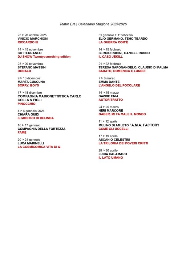 - Abbonamenti: Completo (14 spettacoli) fino al 14 settembre; dal 15 settembre ScegliEra per 5 e under35.