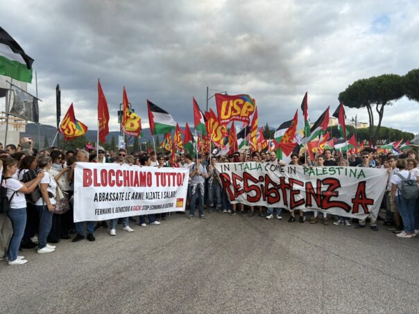 In apertura del corteo i giovani palestinesi, seguiti da sindacati di base, studenti, insegnanti, associazioni, movimenti e molti cittadini comuni. Una grande bandiera della Palestina è stata posizionata sulla “Ruota del tempo”, l’opera dell’artista israeliano Dani Karavan situata proprio nella rotonda all’ingresso dell’autostrada. La manifestazione si concluderà nel parcheggio antistante la piscina comunale di Calenzano. “La mobilitazione proseguirà in tante città – ha detto Dario Furnari della Usb – nel pomeriggio a Firenze saremo all’università, dove ci sarà una passeggiata rumorosa e poi ci sarà un’assemblea in università. Il 24 saremo a Livorno per bloccare di nuovo il porto perché arriverà una nave statunitense che ha trasportato armi in Israele. Al porto di Livorno ci dicono che già è stato bloccato alle 6 di questa mattina un varco”. Da Furnari critiche alla Cgil, che il 19 settembre ha organizzato “uno sciopero generale che non ha funzionato perché nessuno ha potuto scioperare”.
