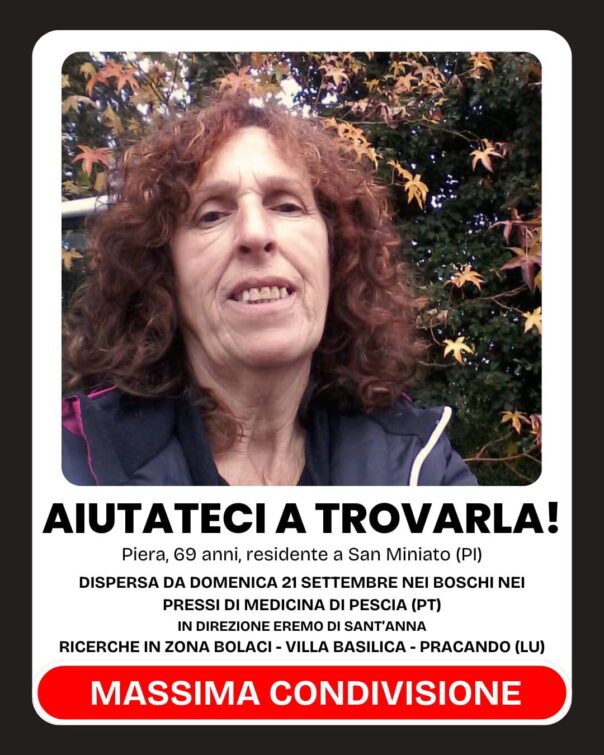 PESCIA (PISTOIA) – E’ scomparsa da cinque giorni Piera Pinna, 69enne originaria di Bosa (Oristano) e residente a San Miniato (Pisa). La donna era andata a cercare funghi domenica 21 settembre 2025, come riferito dal marito 85enne, nella zona boschiva delle colline di Pescia (Pistoia). E’ stato l’uomo a dare l’allarme.