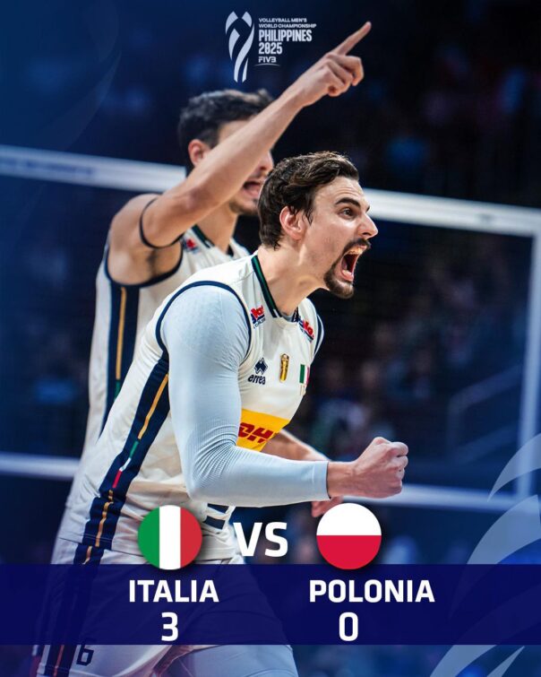 PASAY (FILIPPINE) – Italia è in finale ai Mondiali 2025 di volley maschile. I ragazzi di De Giorgi hanno sconfitto la Polonia 3-0 alla Mall of Asia Arena di Pasay, al termine di una grandissima prestazione. 25-21, 25-22, 25-23 i parziali per gli azzurri che difenderanno il titolo conquistato nel 2022 contro la Bulgaria allenata dall’italiano Gianlorenzo Blengini.
