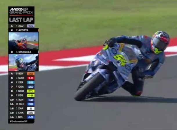 Nonostante un problema alla pressione delle gomme, il rider spagnolo mette insieme una prestazione di grande maturità e si prende il terzo podio stagionale dopo Brno (3°) e Balaton (2°). “C’erano difficoltà nel mantenere la pressione della gomma anteriore. Ho dovuto far passare un paio di moto e poi sono riuscito a tornare a fare il mio passo spingendo. Avevo più ritmo di quanto sono riuscito a mettere in pista”, le parole di Acosta, che ha la meglio su Alex Marquez (Ducati Gresini) nel duello per la piazza d’onore. “È stata una gara di gestione. I primi giri la moto non era ottima e non avevo molto feeling. Sono stato paziente e sono andato avanti. Sono contento del risultato visto che l’anno scorso avevo faticato molto qui. Questo podio mi darà molta fiducia in vista di Philip Island. Complimenti ad Aldeguer che ha fatto un weekend capolavoro”, l’analisi di Alex Marquez, bravo a limitare i danni su una pista non favorevole.