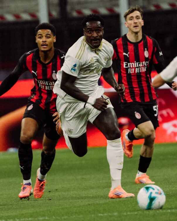 Al 35′ Nkunku, da poco entrato al posto di Gimenez, viene servito con ampio spazio da Leao in area, incrocia col mancino ma Canestrelli in scivolata respinge la conclusione. Al 41′ si ribalta la situazione a San Siro: lancio in verticale per Nzola che scatta in posizione regolare e davanti a Maignan non sbaglia, per il gol che vale il 2-1. Al 45′ ci prova Leao con una girata in area ma la conclusione è debole e facile preda di Semper. Al 48′ il Milan trova il pari. Sugli sviluppi di un corner, la palla arriva sui piedi di Athekame che conclude dalla distanza col destro: strana traiettoria che sbatte sul palo e finisce in rete.