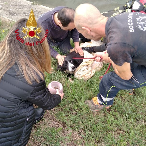 La squadra dei vigili del fuoco è scesa nel canale e ha recuperato il cane apparentemente sfinito con l’acqua che gli copriva completamente le zampe. Il cane è stato affidato alle cure del personale veterinario.