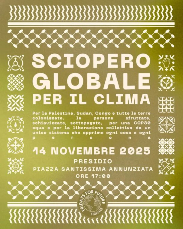 Domani, venerdì 14 novembre 2025, Fridays For Future invita a “diventare marea” e scendere in piazza per gridare al mondo la necessità di piani d’azione concreti che seguano gli obiettivi posti. L’appuntamento a Firenze è in piazza Santissima Annunziata alle ore 16.30 per un piccolo flash mob, a cui seguirà il presidio alle ore 17.