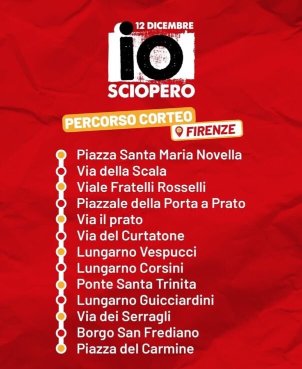 Il corteo partirà da piazza Santa Maria Novella proseguirà su via della Scala, viale Fratelli Rosselli, piazzale Porta a Prato, Il Prato, Curtatone, lungarno Vespucci, lungarno Corsini, ponte Santa Trinita, lungarno Guicciardini, piazza Sauro, borgo San Frediano per concludersi in piazza del Carmine. Per ulteriori informazioni Autolinee Toscane invita gli utenti a consultare il sito dell’azienda, la app at bus o i canali social, oppure a chiamare il numero verde 800 14 24 24.