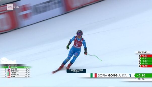 Quarta un’altra azzurra, Elena Curtoni a 73 centesimi dalla connazionale, tredicesima Roberta Melesi a 1″05. Per Goggia, 33 anni, si tratta del quarto successo in Val d’Ise’re, dopo quelli in discesa del 2020 e 2021 e in supergigante nel 2021. Sofia nel tratto iniziale ha sciato un po’ con il ‘freno a mano’ tirato ma nel secondo e’ stata perfetta. Nella classifica di Coppa di superG, guida Robinson con 180 punti davanti a Goggia (160) e Vonn (110) mentre nella generale Goggia balza dal nono al terzo posto con 372 punti alle spalle di Mikaela Shiffrin (558) e Robinson (484).