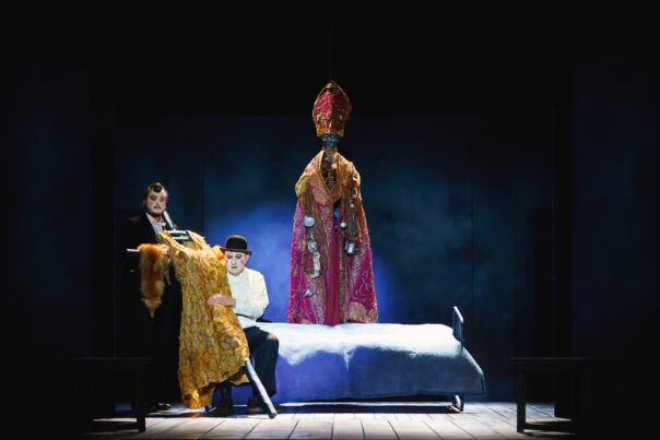 Edipus è una ripresa di uno spettacolo del 1994, che debuttò proprio al Teatro di Rifredi, sempre con la compagnia Lombardi – Tiezzi e Sandro Lombardi come protagonista (alcune immagini del primo spettacolo vengono proiettate sullo sfondo a fine pièce), ma non è un semplice restauro filologico. Federico Tiezzi (regista) e Sandro Lombardi infondono al testo, sempre attualissimo, una vita nuova. E l’inevitabile invecchiamento dell’attore protagonista lo rende ancora più adatto a incarnare lo Scarrozzante: un capocomico decaduto, stremato nelle forze e roso nell’anima come i costumi del suo baule lo sono dalle tarme. Abbandonato dall’attrice e compagna che lo ha mollato per un borghese brianzolo e dall’attor giovane passato a fare cabaret e costretto perciò a interpretare tutti i ruoli (Laio, Edipo, Giocasta, Dioniso…), nella messinscena dell’Edipo di Sofocle che ostinatamente ripropone.