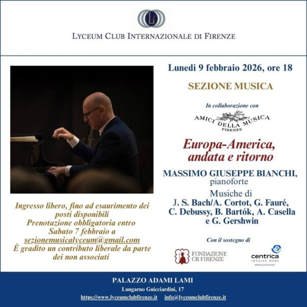 FIRENZE – Lunedì 9 febbraio alle 18, nella sede del Lyceum in Palazzo Adami Lami (Lungarno Guicciardini, 17 – Firenze), si ascolta il pianista Massimo Giuseppe Bianchi per un concerto in collaborazione con gli Amici della Musica di Firenze.