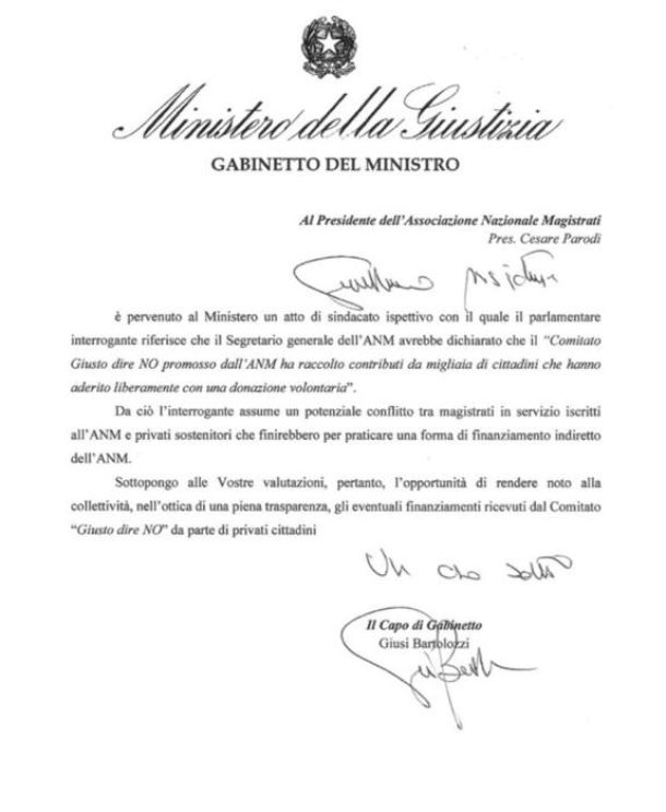 Lo scrive il capo di gabinetto del ministero della Giustizia, Giusi Bartolozzi, in un documento indirizzato al presidente dell’Anm, Cesare Parodi, in cui si sottopone alle valutazioni dell’Associazione “l’opportunità di rendere noto alla collettività, nell’ottica di una piena trasparenza, gli eventuali finanziamenti ricevuti dal Comitato da parte di privati cittadini”.