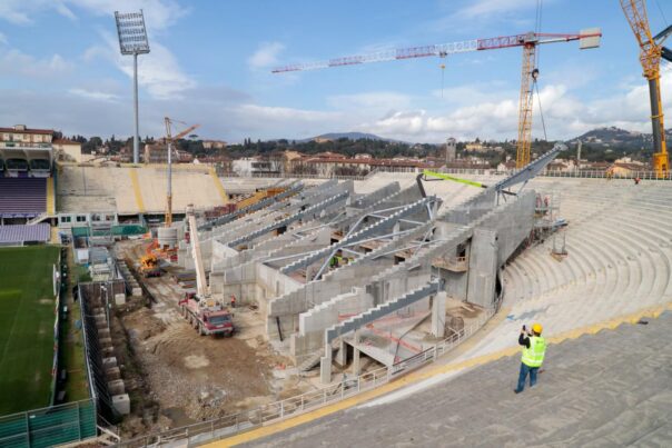 “Questo è un momento cruciale – ha dichiarato la sindaca, Sara Funaro -. inizia oggi il montaggio delle travi in acciaio, che andranno a sorreggere sia i gradoni che sono stati realizzati in fabbrica e che verranno portati successivamente, sia la copertura della nuova Curva Fiesole. Stanno continuando, come da cronoprogramma, tutte le lavorazioni, sia nella parte delle costruzioni interne che nel restauro del cemento. Si tratta di travi di circa 40 metri, che avranno un impatto importante anche dal punto di vista visivo: realisticamente dalla fine del mese di marzo si inizierà a vedere la profilatura nuova della Curva”.