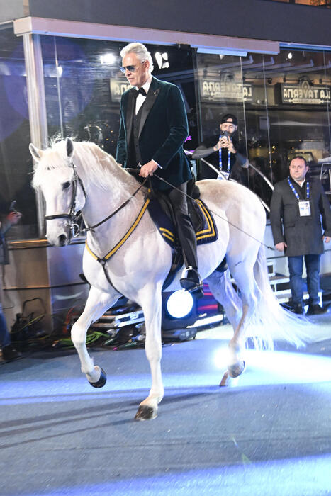 OSPITI – Il superospite è Andrea Bocelli: arriva in sella al suo cavallo bianco Caudillo, all’esterno dell’Ariston, poi al pianoforte – introdotto dalle immagini di Pippo Baudo – canta Il mare calmo della sera, brano scritto tra gli altri da Zucchero, con cui vinse tra le Nuove Proposte nel 1994, e poi Con te partirò. È standing ovation.