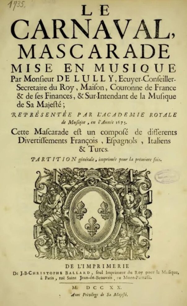 Le carnaval debuttò al Louvre nel gennaio 1668, con la partecipazione attiva, come ballerino, dello stesso Re Sole, e fu ripreso all’Opéra nell’autunno 1675, perdendo il “Royale” del titolo per ché il re, trentottenne e appesantito dai chili di troppo, non danzava più sul palco. In una bizzarra antologia di spunti teatrali, si alternano in scena personaggi legati al mondo pastorale, borghese, della commedia dell’arte, senza tralasciare gli esotismi e le “turcherie” tanto in voga all’epoca; i testi sono di Benserade, Molière e Quinault. Arlecchino e Trivellino, Pulcinella e Scaramouche, il borghese gentiluomo, i pastori dell’Arcadia, il Muftì ottomano, spagnoli, italiani, zingari, baschi ed egiziani animano le diverse entrées della Mascarade: nove nella prima versione e dieci, più un numero vocale come prologo.