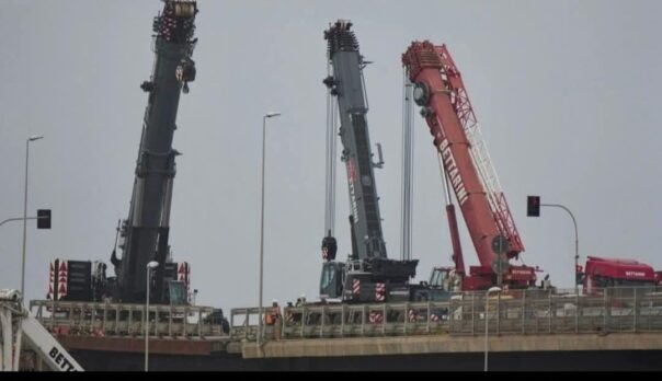 Le gru a lavoro per sollevare il ponte (foto dai social)