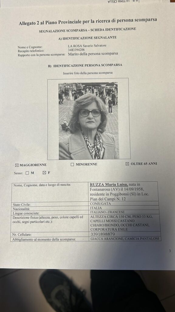 POGGIBONSI (SIENA) – Sono ore d’ansia per la famiglia di Maria Luisa Ruzza. La donna di 68 anni è dispersa da oggi, 5 aprile 2026, a Poggibonsi, in località Pian di Campi. L’allarme è stato dato dal marito. Sul posto i vigili del fuoco per le ricerche.