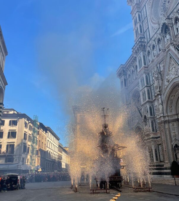 La colombina, congegno trasportato da un razzo innescato dal cero santo – ‘accensione’ a opera dell’arcivescovo di Firenze, monsignor Gherardo Gambelli, partita dall’altare della Cattedrale, ha raggiunto il Brindellone, posizionato tra Duomo e Battistero e poi è tornata indietro senza alcun intoppo. La tradizione tramanda che se riesce a volare e a rientrare senza fermarsi è segno di speranza e di buoni raccolti. Come da tradizione anche la benedizione alla folla e al Brindellone, prima che fosse acceso, da parte di monsignor Gambelli. Dopo lo Scoppio del carro la prosecuzione della messa in Duomo, celebrata dall’arcivescovo. Tra i partecipanti la sindaca di Firenze Sara Funaro e anche il presidente della Toscana Eugenio Giani.