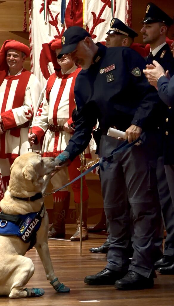 Quest’anno premiata, a titolo di riconoscimento per l’impegno profuso e la collaborazione prestata alla Questura – in particolare nell’indirizzo e nell’accoglienza dei numerosi cittadini che si recano ogni mattina presso il locale Ufficio Immigrazione – l’Associazione Nazionale della Polizia di Stato – Sezione di Firenze. L’attestato premiale è stato consegnato dal Questore Lamparelli al Presidente della sezione fiorentina Fabrizio Polverini. L’ultimo riconoscimento, tra tanti sorrisi e qualche lacrima in platea, è stato consegnato al cane poliziotto Rocky, da oggi in pensione, accompagnato a ritirare il premio dal suo conduttore Luca: Rocky in servizio presso le Unità Cinofile Antisabotaggio della Polizia di Stato di Firenze, ha fornito nel corso della carriera, un contributo determinante alle attività istituzionali, distinguendosi per il suo fiuto, l’efficienza, la prontezza e l’assoluta dedizione. Fedele compagno di lavoro e insostituibile supporto, sarà affidato definitivamente al proprio conduttore ancora circondato dall’affetto della sua famiglia della Polizia di Stato.