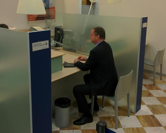 Il direttore entrato nella filiale di una banca e si è seduto in attesa di poter accedere allo sportello, seguito da cronisti e fotografi.