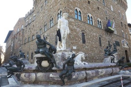 E' in prima linea, Firenze, nel ricordo delle vittime del covid. Un drappo nero è stato messo stamani, 18 marzo, alla statua del Nettuno in piazza Signoria, conosciuta come il...