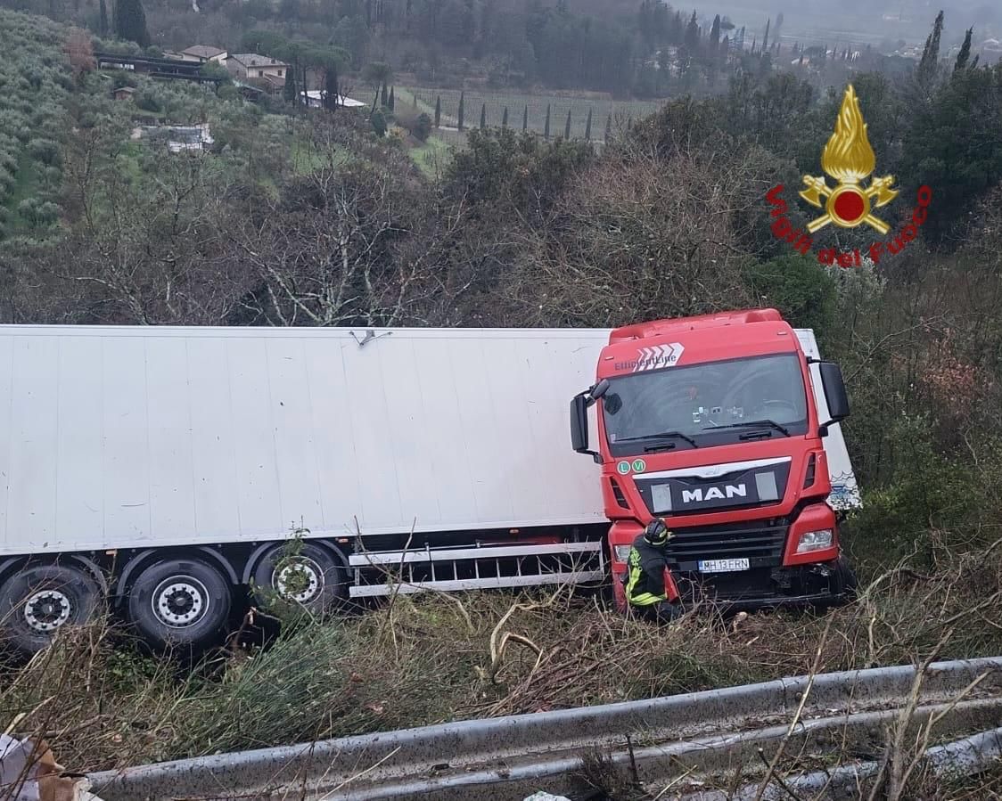 Arezzo: tir si ribalta sulla statale 73 e finisce nella scarpata
