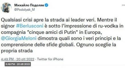 Kiev, portavoce Zelensky: “Berlusconi sotto impressione ru-vodka, mentre Meloni è vera leader”