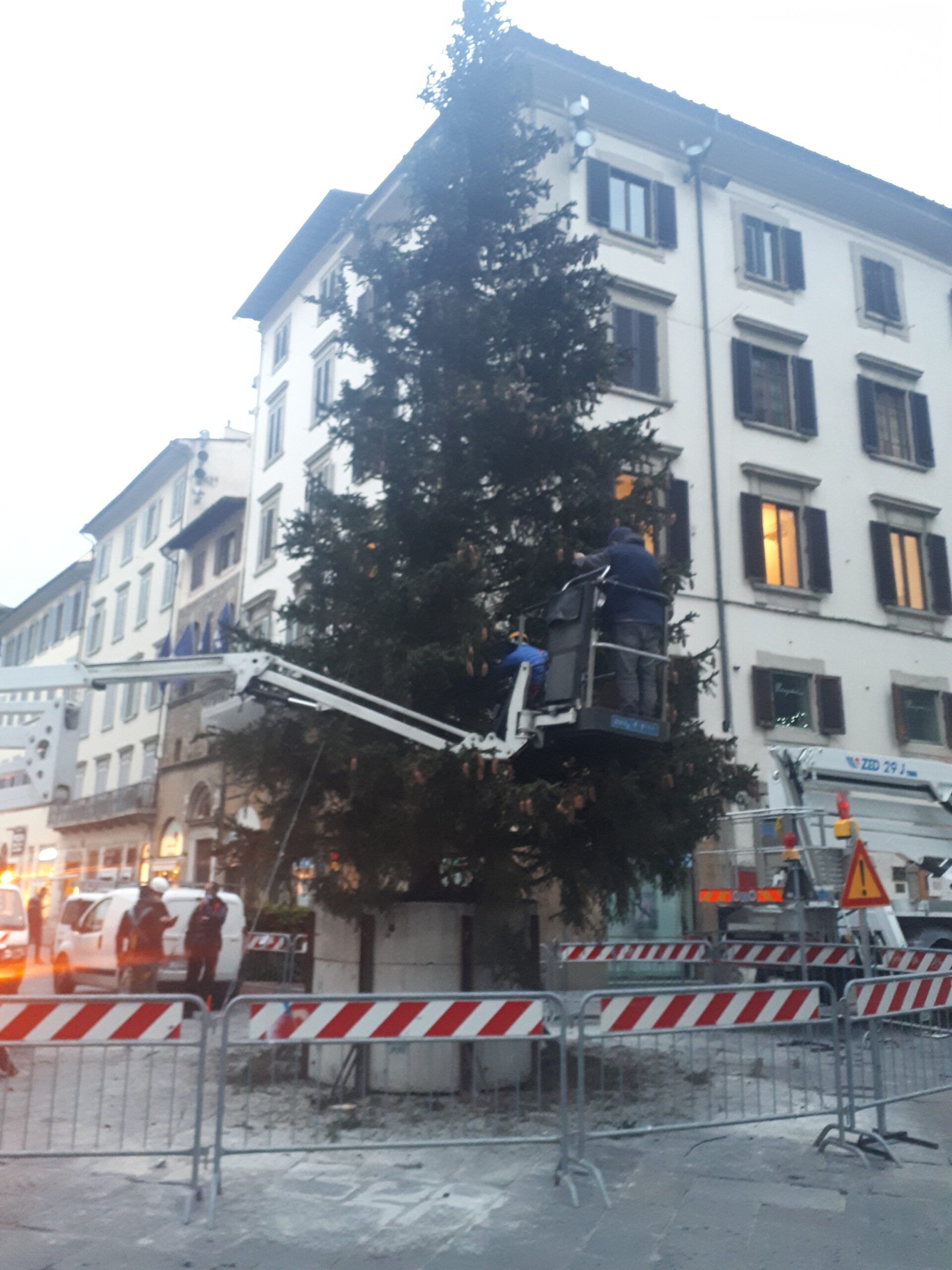 E' arrivato in piazza del Duomo, a Firenze, il gigantesco abete rosso, alto 12 metri, prelevato dal Passo San Pellegrino, che sarà acceso dal sindaco, Dario Nardella, il 7...