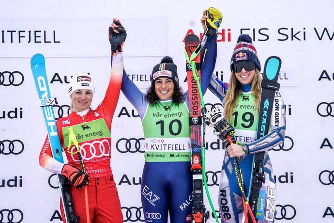 In una gara sospesa a più riprese a causa della nebbia norvegese, la valdostana ha fatto segnare il miglior tempo in 1'37"30, staccando di 61 centesimi la svizzera Lara...