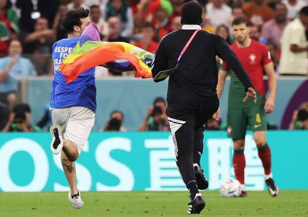 Mondiali Qatar: Portogallo – Uruguay 2-0. Italiano Mario Ferri invade il campo con bandiera arcobaleno
