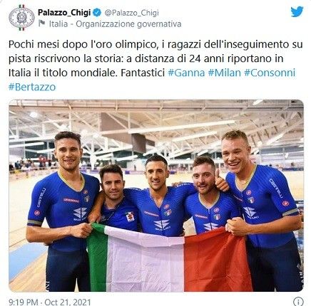L'Italia torna a vincere il Mondiale dell'inseguimento a squadre dopo 24 anni. Il quartetto azzurro campione olimpico a Tokyo, formato da Filippo Ganna, Jonathan Milan, Simone...