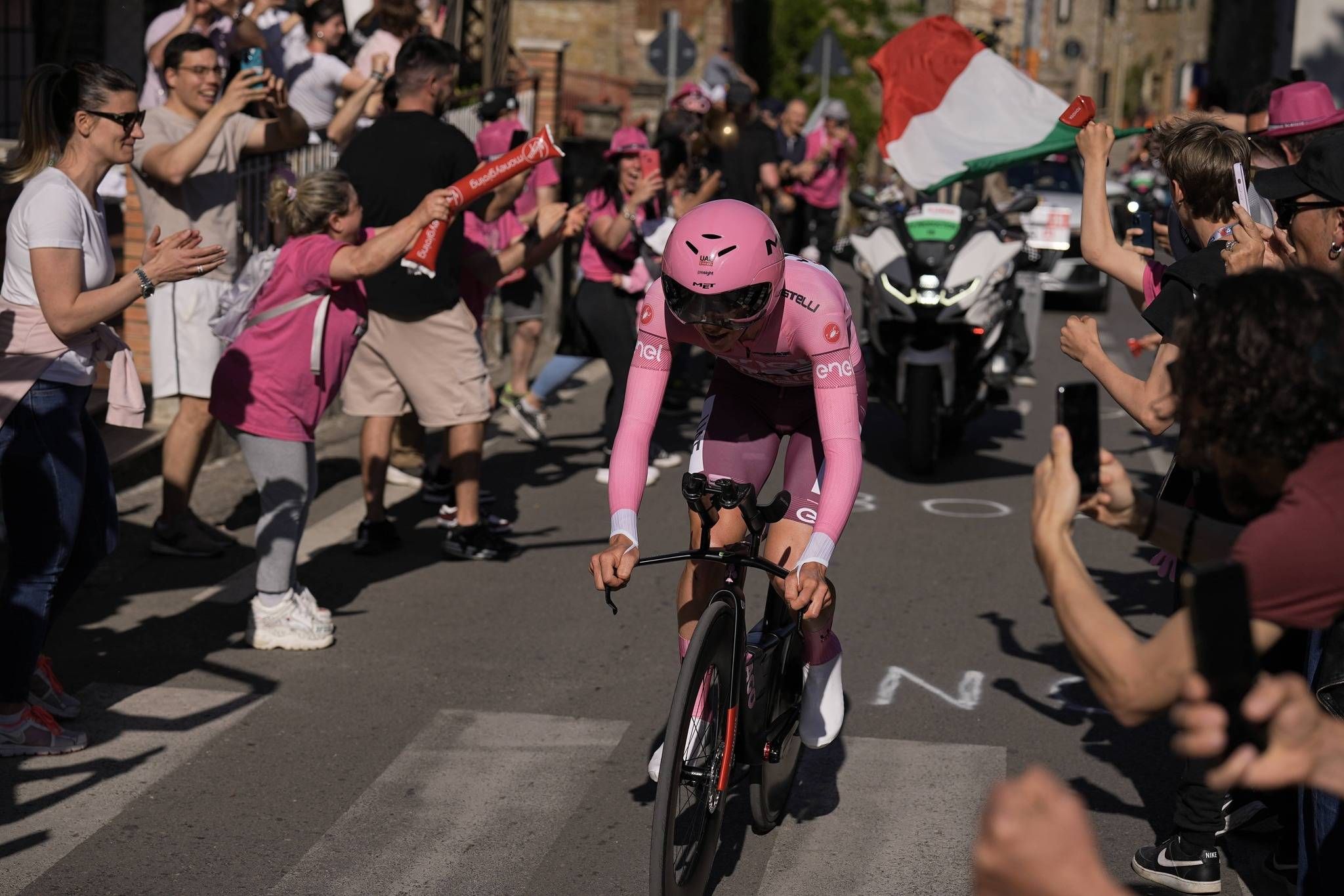 La maglia rosa Tadej Pogacar vince la settima tappa, la cronometro individuale di 40,6 chilometri con partenza da Foligno e arrivo a Perugia