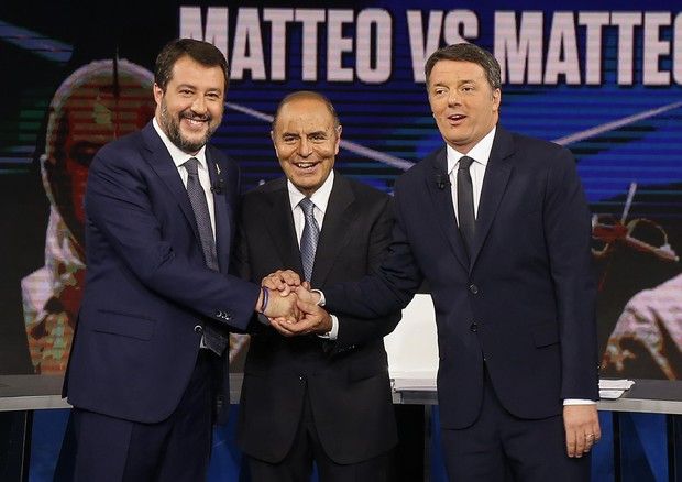 Completo blu per Matteo Salvini e Matteo Renzi, cravatta scura a tinta unita per il senatore Pd, scura con piccola fantasia per il capo leghista, nel confronto tv a Porta a...