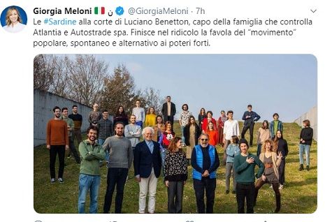 Sardine in visita da Benetton e Toscani, l’attacco della Meloni e di Toti