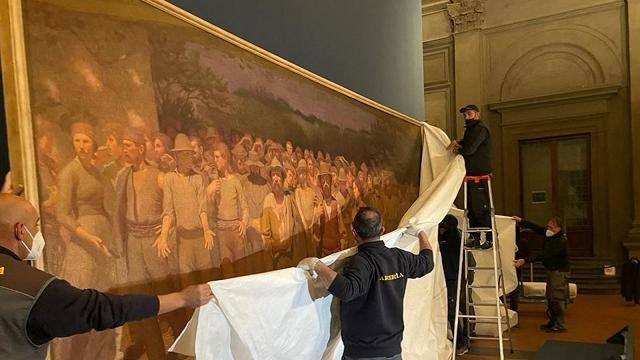 Preview de "Il Quarto Stato" di Pellizza da Volpedo, opera simbolo delle lotte operaie, nel Salone dei Cinquecento di Palazzo Vecchio, dove sarà visibile al pubblico da...