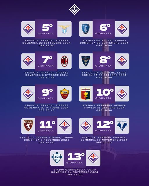 foto ACF FiorentinaMILANO – La Lega Serie A ha reso noto il calendario degli anticipi e posticipi dalla quinta alla tredicesima giornata. Ecco date, orari e dirette...