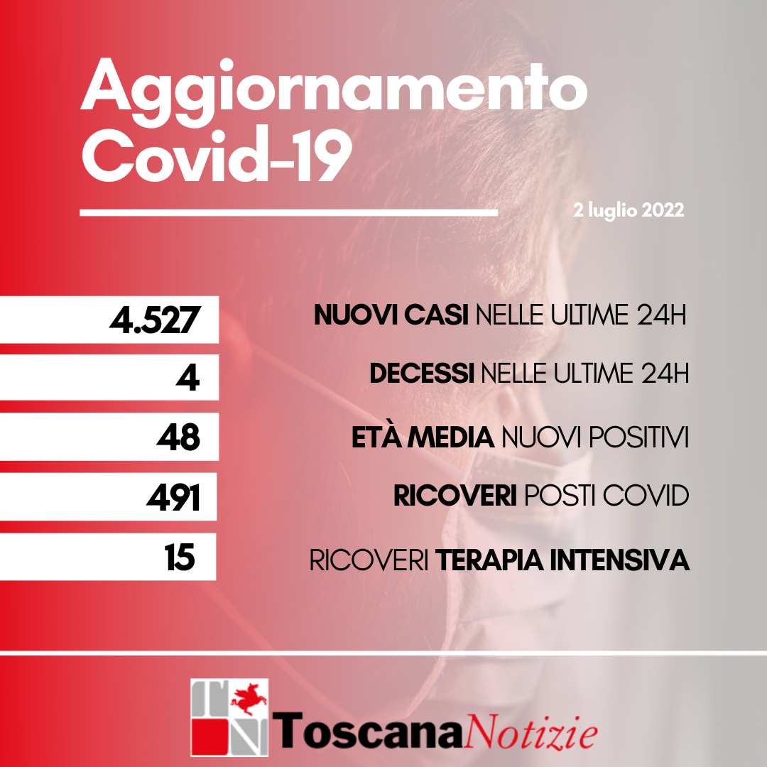 Sono 4 i morti per coronavirus, in Toscana, oggi 2 luglio 2022. Si tratta di 4 donne con età media di 86 anni. Ed è sempre molto alto il numero dei nuovi contagiati: 4.527 (842...