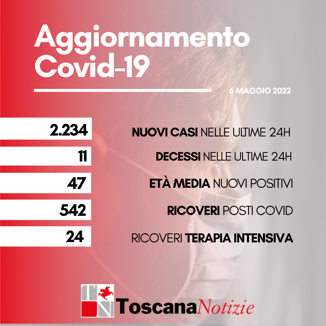 Sono 11 i morti per coronavirus, in Toscana, oggi 6 maggio 2022. Si tratta di 6 uomini e 5 donne con età media di 80 anni. Mentre sono 2,234 i nuovi contagiati (534 confermati...
