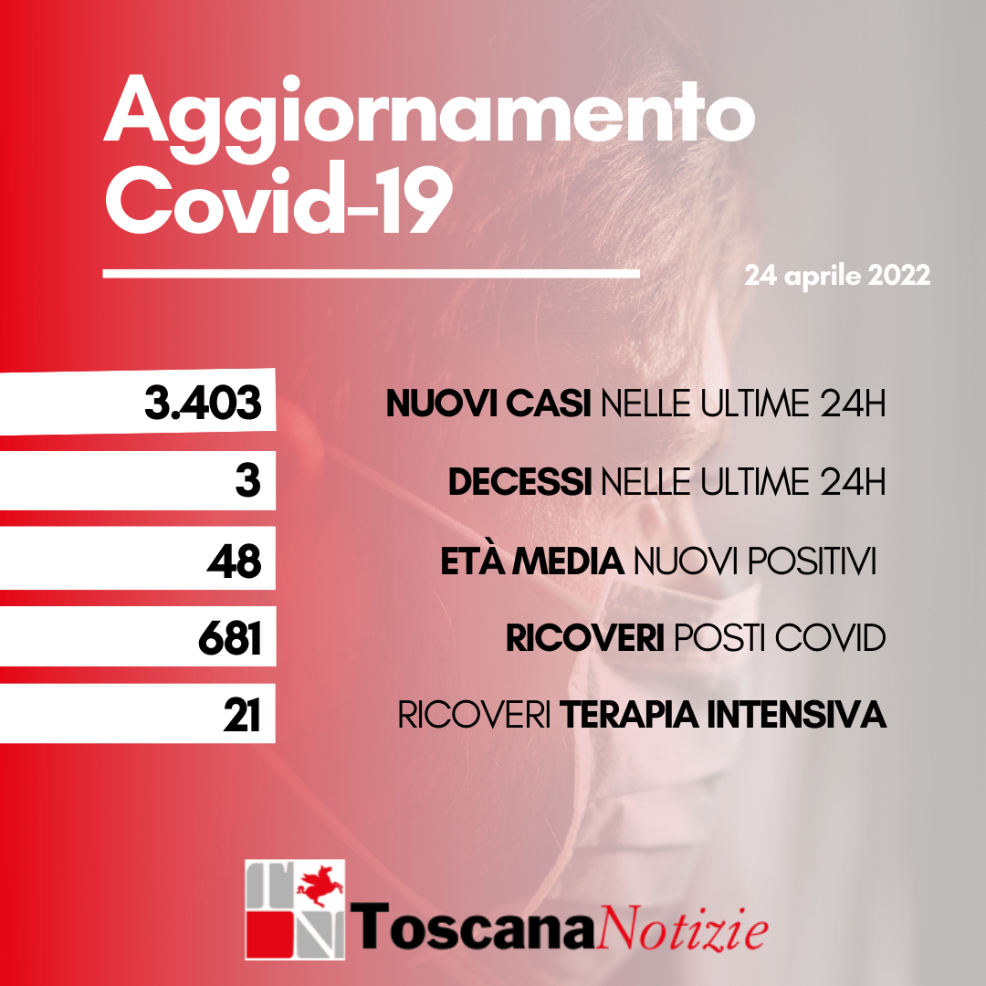 - Nessun commento su Covid, Giani: 3.403 nuovi contagi in Toscana, oggi 24 aprile. Tasso positivi 16,76%
