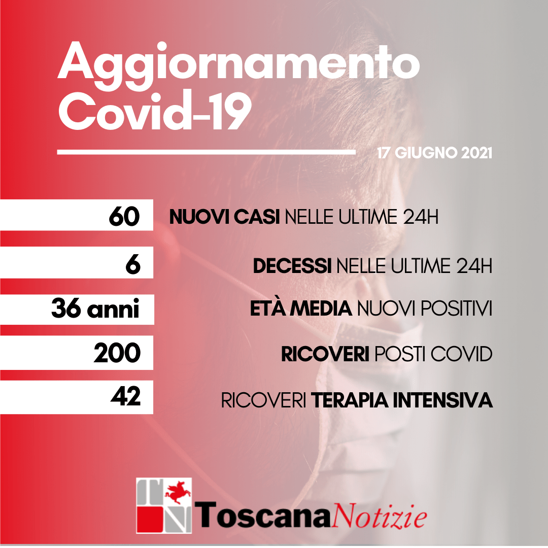 Sono 6 i morti per coronavirus di oggi, 17 giugno 2021, in Toscana. Si tratta di 4 uomini e 2 donne con età media di 75 anni. Relativamente alla provincia di residenza, le 6...
