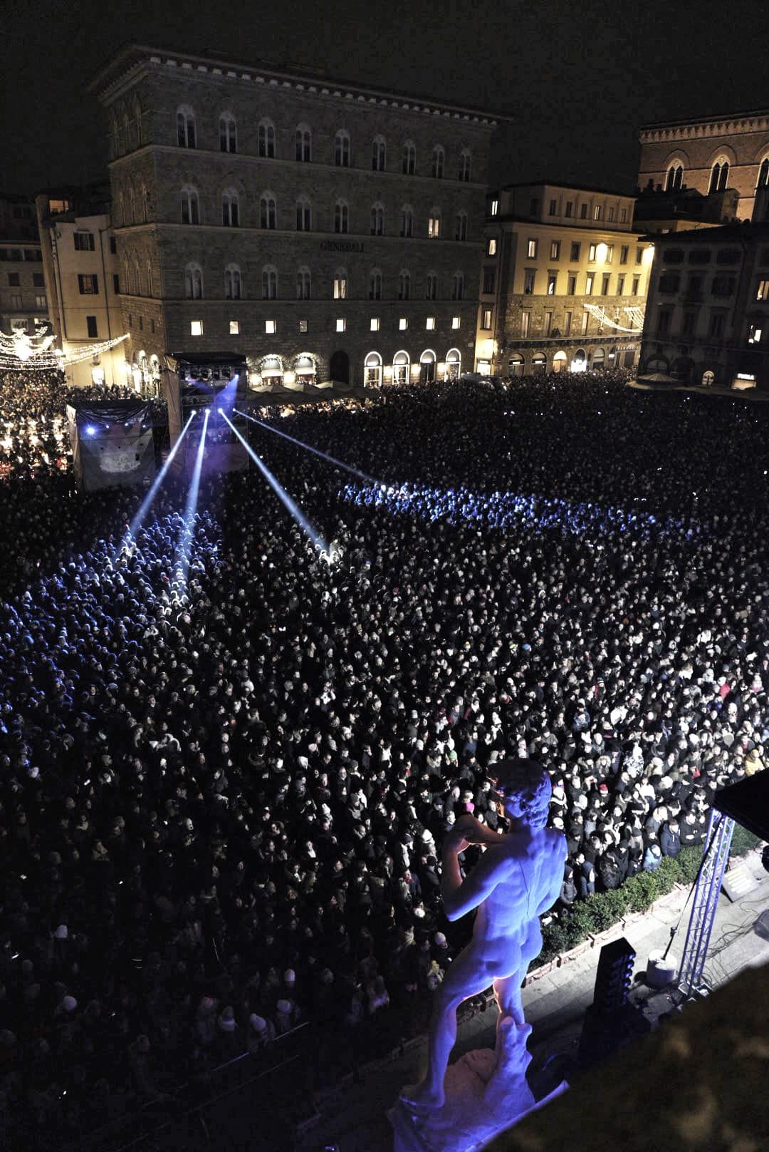 Notte di Capodanno 2025 con festa, a Firenze: nelle piazze e sui lungarni. Musica e fuochi d'artificio. Piazza della Signoria strapiena, come documenta anche la foto della...