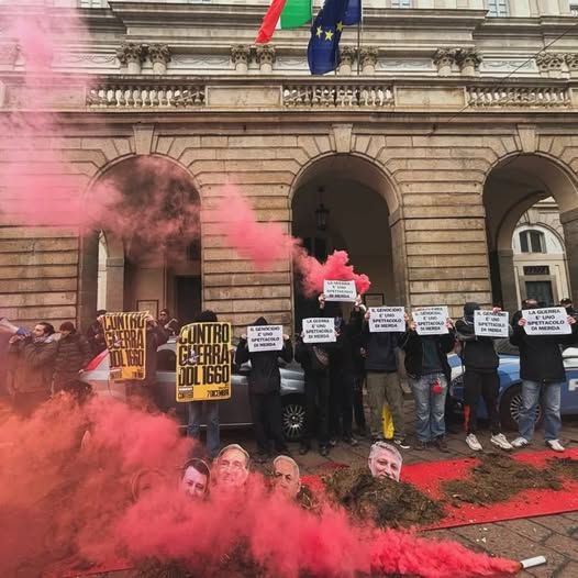 Letame davanti al teatro della Scala stamattina, 7 dicembre 2024, dove c'è stata un'anteprima del corteo di protesta contro la guerra e il ddl Sicurezza in concomitanza con la...