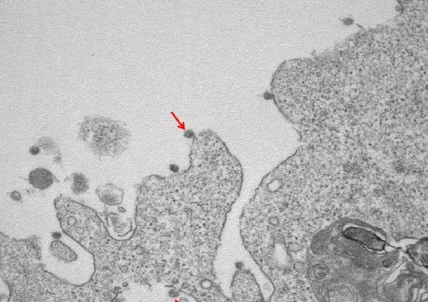 >Le immagini al microscopio elettronico mostrano le particelle virali adese alle membrane delle cellule e la loro tipica corona di glicoproteine superficiali. L'annuncio in una...