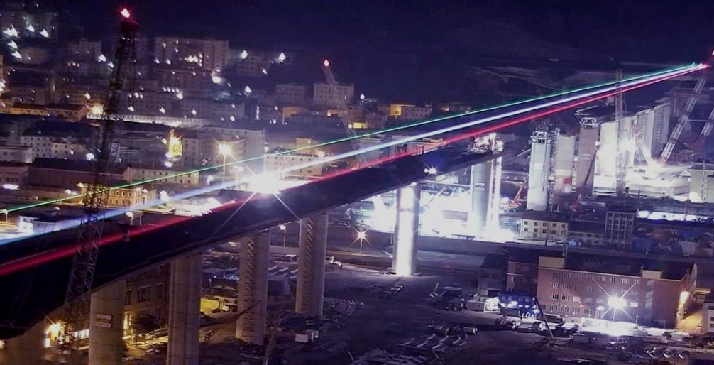 A Genova un fascio laser tricolore apre la strada al ponte che avanza e lancia un messaggio a tutti gli italiani