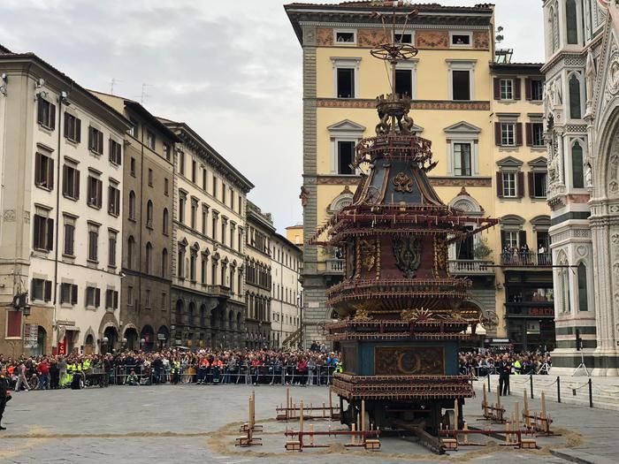 Il congegno è partito dall'altare della cattedrale al momento dell'intonazione del Gloria, ha acceso i mortaretti e i fuochi d'artificio sul carro, ed è tornato al suo posto...