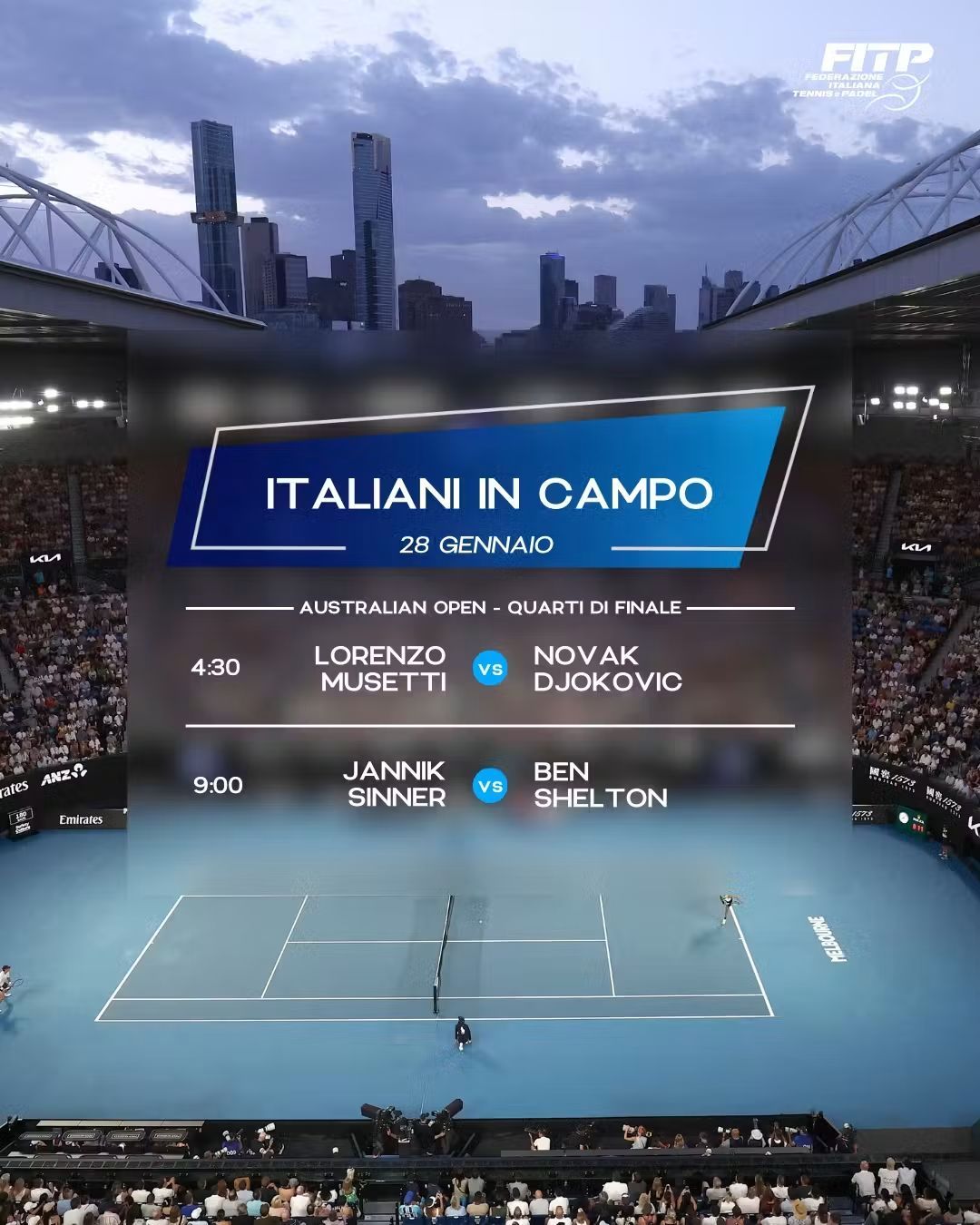 Lorenzo Musetti-Novak Djokovic e Jannik Sinner-Ben Shelton valgono la prima semifinale Slam italiana della storia e non solo. Domani, 28 gennaio 2026 il tennis azzurro si...