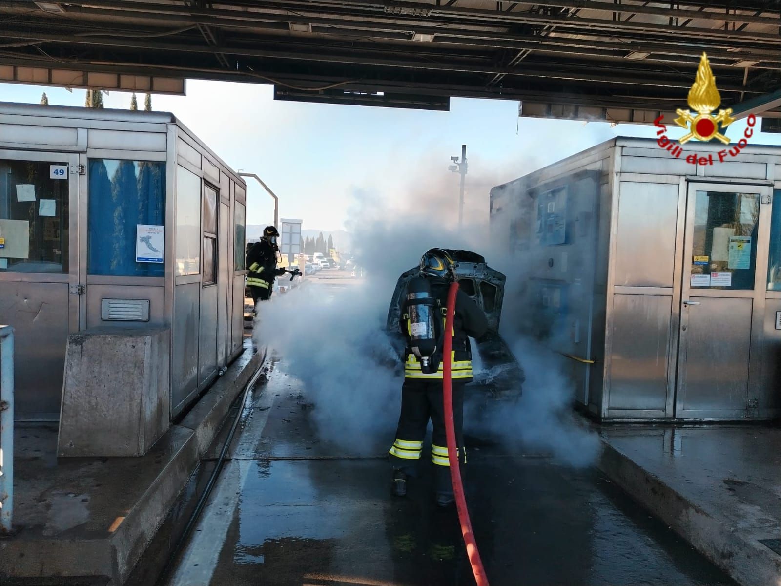 I vigili del fuoco sono intervenuti questa mattina, 12 gennaio 2025, per un incendio che ha interessato una vettura ferma al casello di Prato Ovest