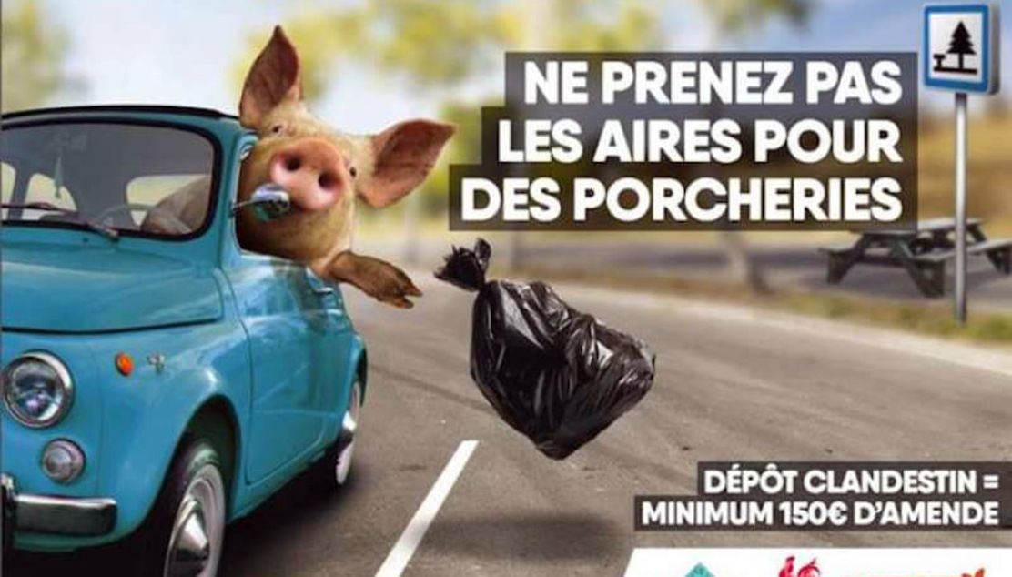 Nell’immagine che promuove la campagna, si vede un maiale lanciare un sacco dell’immondizia fuori da una macchina, una vecchia Fiat 500
