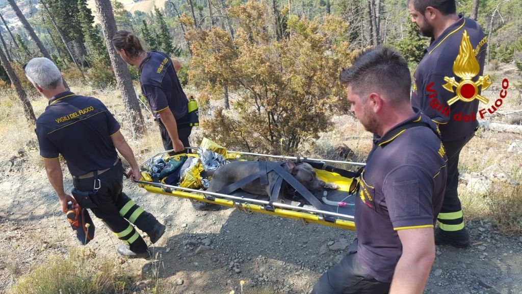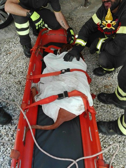 La squadra dei vigili del fuoco ha provveduto al recupero del cane con una barella 'toboga' e poi lo hanno affidato alle cure di un veterinario